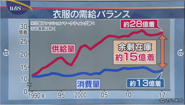 アパレル業界では製造された商品の約半分(10億着~15億着)が売れ残り環境を汚染する産業として2位にランクインしている。