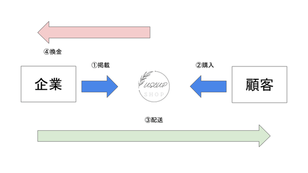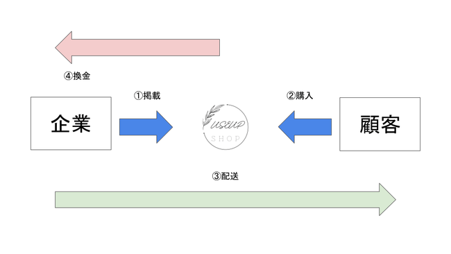 購入者側は通常のECサイトのようにサイトから商品を選択し、購⼊後は商品を掲載していた企業から商品が届くような仕組みとなっている。