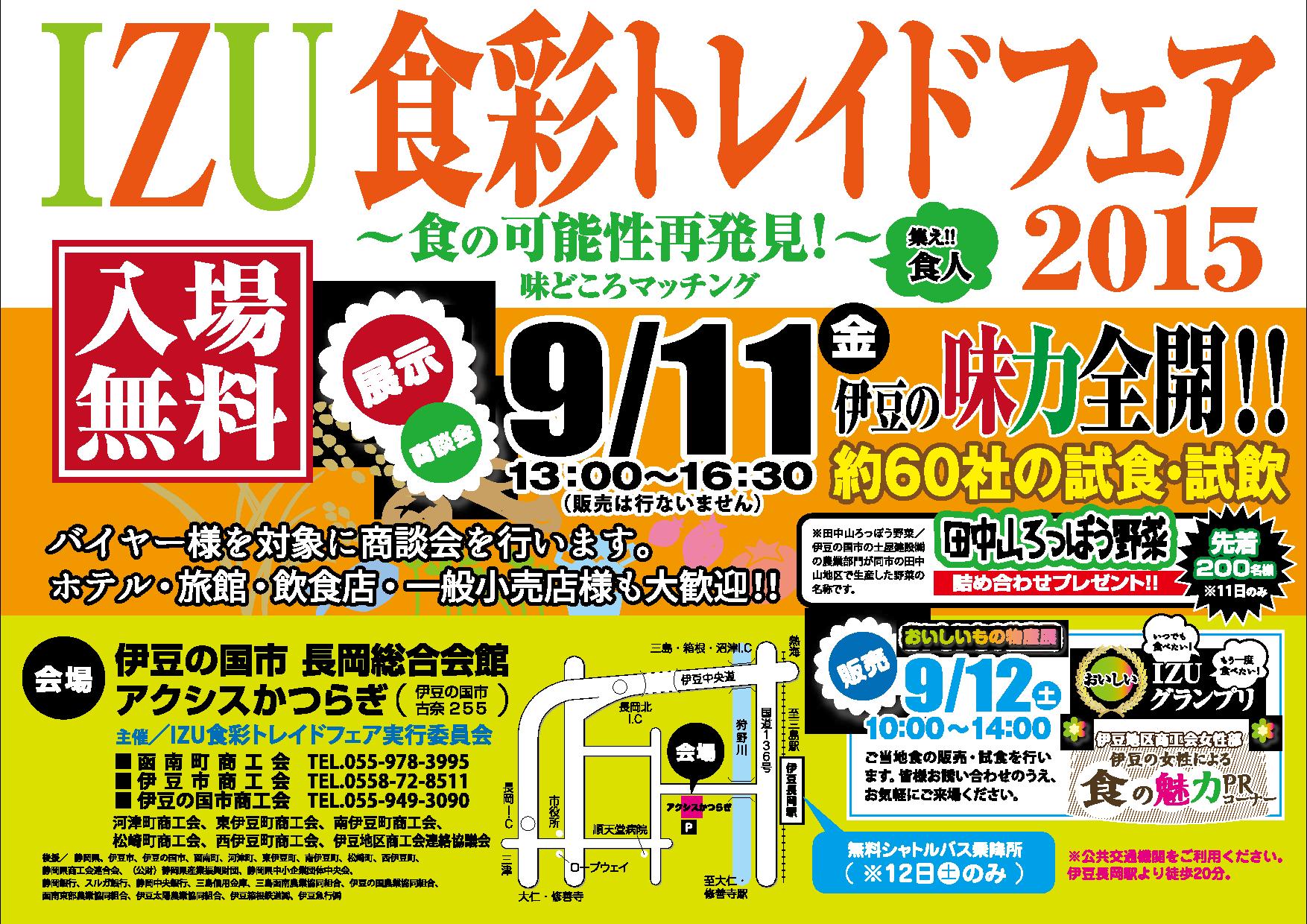 2015年9月2日 14:30IZU食彩トレイドフェア実行委員会(函南町・伊豆市・伊豆の国市を中心とした8市町の商工会)は、生産や製造を行っている中小企業に対する支援策としてビジネスマッチングフェア『IZU食彩トレイドフェア』を2015年9月11~12日の2日間、伊豆の国市・長岡総合会館(アクシスかつらぎ)にて行います。
