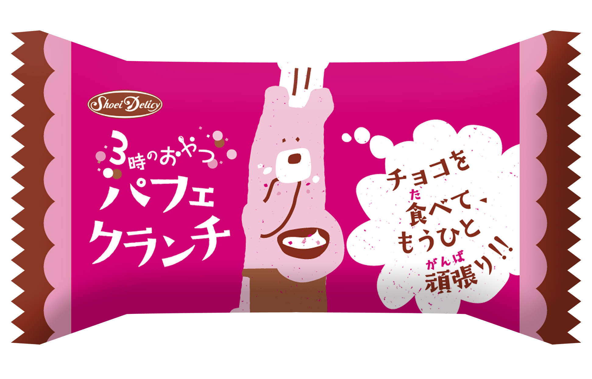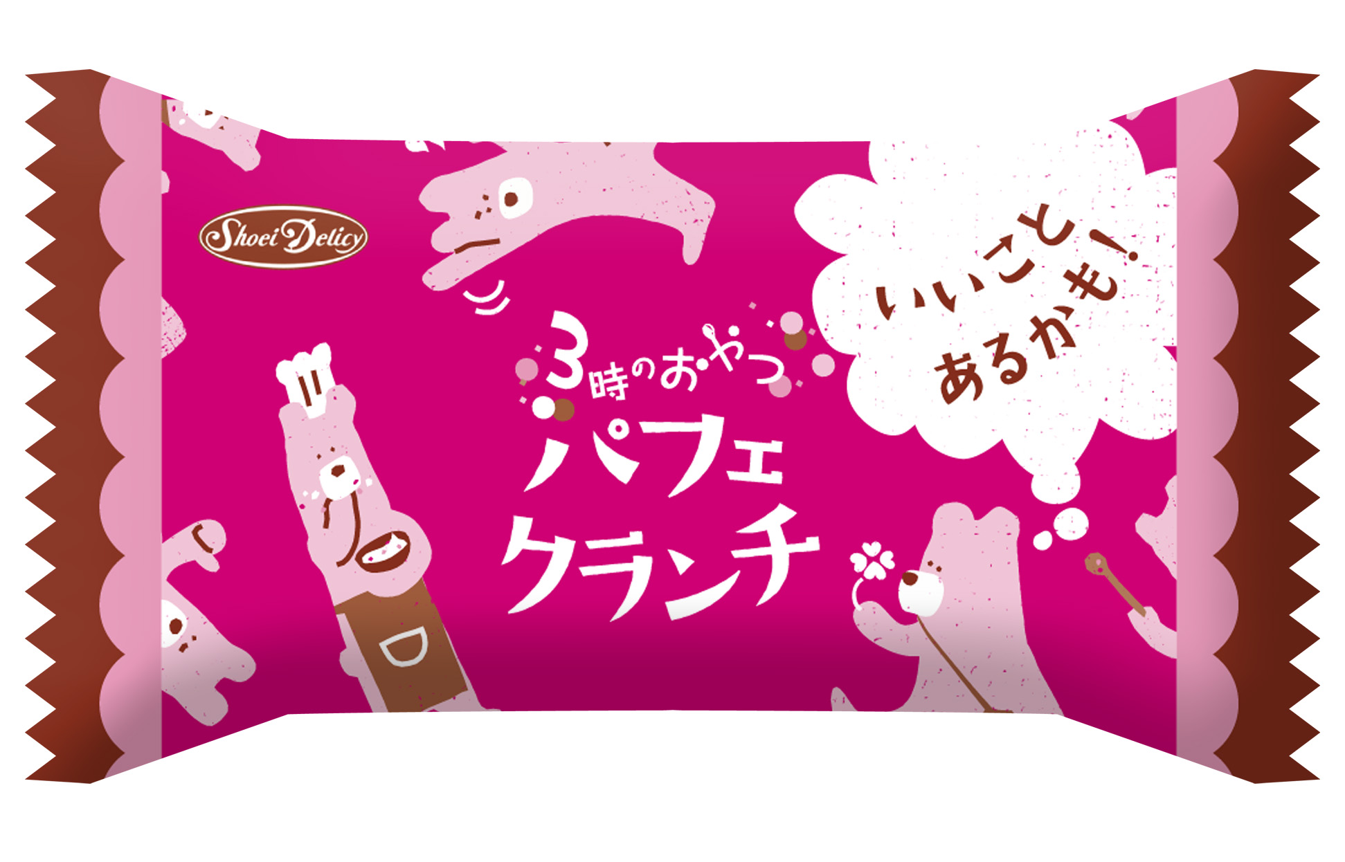 ピンク色をベースに、ギンガムチェックのクロスを敷いたテーブルに置かれたパフェの写真を配置、たっぷりとフルーツが乗った迫力のあるパフェが“食べる前のワクワク感”を演出します。パフェクランチ色のクマちゃんのイラストと踊る文字を配したパッケージは手に取るだけで気分が上がり、3時のおやつまで待ちきれないようなかわいいデザインに仕上がりました。