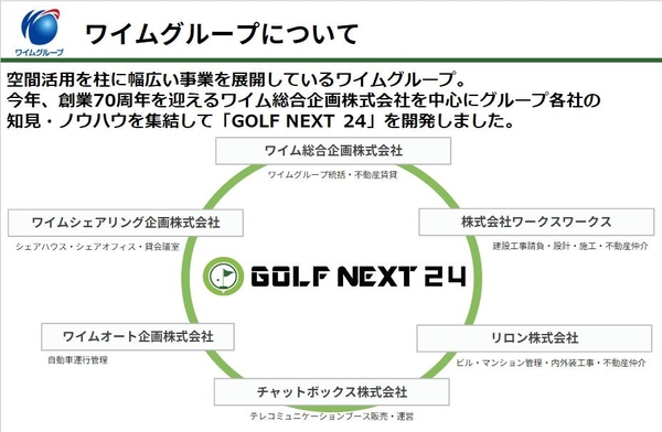 そして、運用に関してはシェアオフィスやシェアハウス・貸会議室など無人有人施設を多く運営している会社(ワイムシェアリング企画(株))が担当、施設の衛生管理には不動産施設管理をメインとする会社(リロン(株))と、グループで連携してGOLF NEXT 24は運営しております。