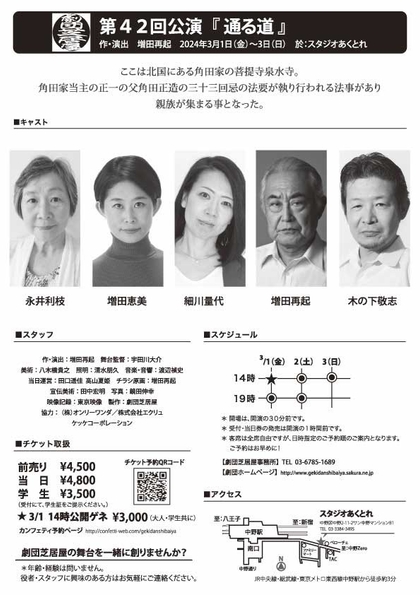 劇団芝居屋第42回公演『通る道』が2024年3月1日 (金) ~3月3日 (日)にスタジオあくとれ(東京都中野区中野2-11-2サン中野マンションB1)にて上演されます。チケットはカンフェティ(運営:ロングランプランニング株式会社、東京都新宿区、代表取締役:榑松 大剛)にて発売中です。