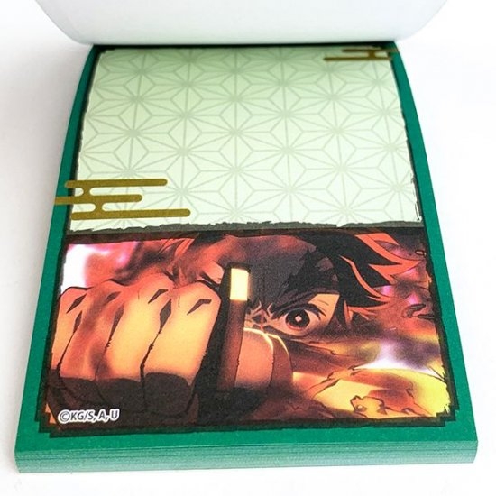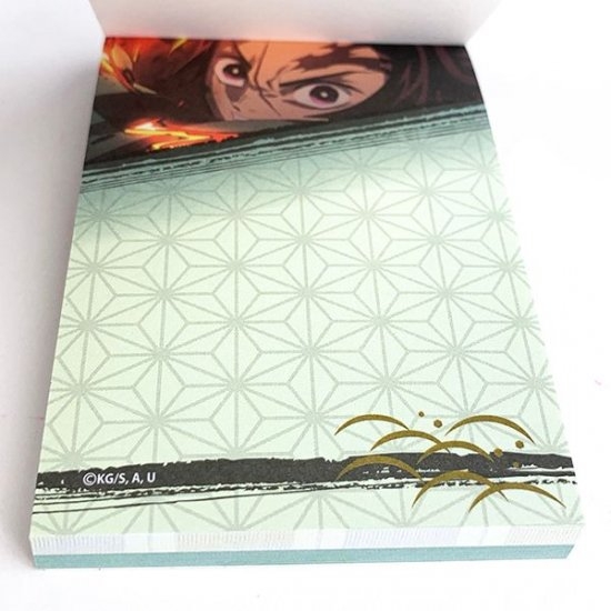 お次は、炭治郎デザインのメモ帳です。炭治郎のイメージカラーでもあるグリーンを基調としていて、アニメのシーンなどが印刷されています。