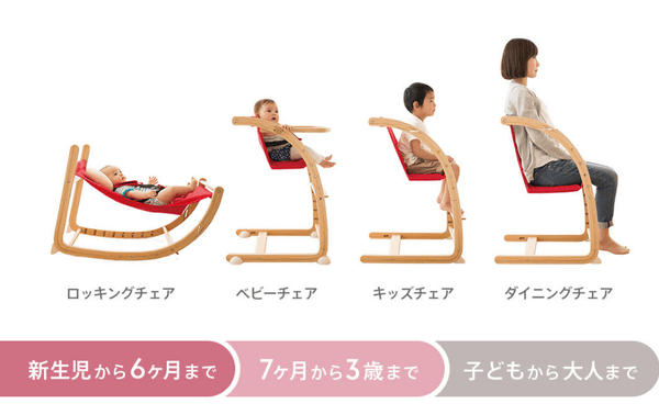 対象:0~6カ月頃(ロッキングチェア)/7カ月~36カ月頃(ハイチェア)/子ども〜(キッズチェア )/大人(ダイニングチェア )