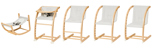 新生児から大人まで座れる一生モノの椅子です。生まれた頃の思い出を刻みながら、形を変えて赤ちゃんと一緒に成長します。シンプルな佇まいは暮らしの道具として大人になっても愛着を持って長くお使いいただけます。