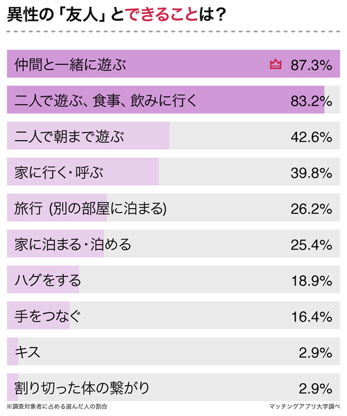 異性の友人とはできない行為として、男性のほうが多く挙げたのは「二人で朝まで遊ぶ」「二人で遊ぶ」です。中には「グループで遊ぶ」を挙げた人もいました。このように「異性の友人とできないこと」として挙げた回答の割合にバラつきがあることから、男性のほうが異性の友人との付き合い方に関してに個人差が大きいといえそうです。
