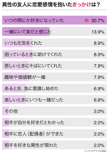 異性の友人を好きになったきっかけは「いつの間にか」が3割で最多