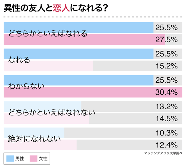 また男性は「わからない」「どちらかといえばなれる」「なれる」がそれぞれ25.5%と票を割ったのに対し、女性は「わからない」がもっとも多く30.4%で「なれる」(15.2%)のおよそ2倍でした。このことから、女性のほうが友人から恋人になることに対して慎重であることがうかがえます。