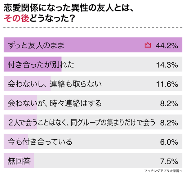 異性の友人となんらかの恋愛関係になった人に「その後の友人との関係」を聞いてみたところ、もっとも多かったのは「ずっと友人のまま」の44.2%で、次が「付き合ったが別れた」の14.3%でした。半数近くの人が友人として関係性を維持していることがわかります。