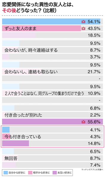 この結果だけを見ると、友人関係を継続したいならば付き合わないほうが良いといえるかもしれません。