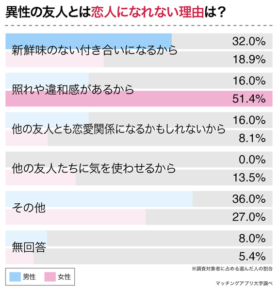 男性は「最初から新鮮味のない付き合いになるから」が32% で1位でしたが、女性は「友人を恋人として見ることに、照れや違和感があるから」が51.4%と過半数を超えました 。回答としては分かれたものの、いずれにも共通しているのは、友人としての付き合いと恋人としての付き合いは違うという価値観です。
