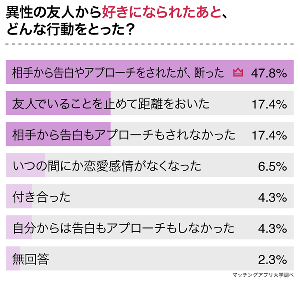 異性の友人から好きになられた場合はどうでしょうか。もっとも多かった行動は「相手から告白やアプローチをされたが、断った」が47.8%、次が「友人でいることを止めて距離をおいた」「相手から告白もアプローチもされなかった」で同率17.4%でした。