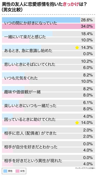 1位の「いつの間にか好きになっていた」は、割合こそ違うものの、男女どちらも順位は同じです。ただ2位以下に関してはランクインした項目が大きく異なる結果でした。