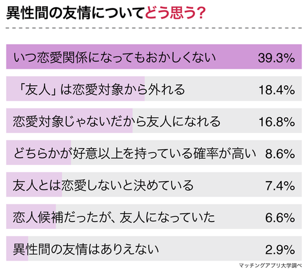もっとも多かったのは「気の合う異性と友人になるため、いつ恋愛関係になってもおかしくない」の39.3%です。また「どちらかが好意以上を持っている確率が高い」の8.6%、「友人とは恋愛しないと決めている」の7.4%、「異性間の友情はありえない」の2.9%を合わせた58.2%の人が、友情から恋愛感情に変化する可能性を認めた回答でした。