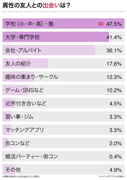 出会いのきっかけは「学校 (小・中・高)・塾」と答えた人が47.5%で最多数。青春時代に性別を越えた交友関係を持った人が、5割近くに及びました。