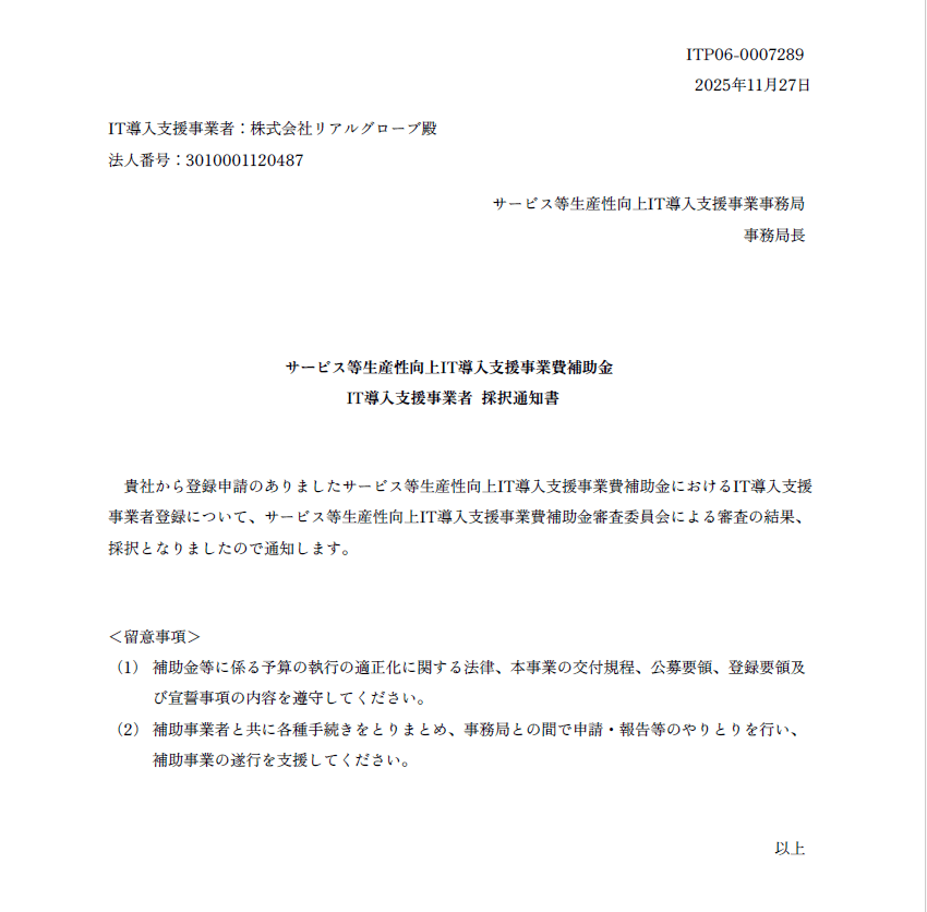 株式会社リアルグローブ(所在地:東京都千代田区、代表取締役社長:大畑 貴弘、以下 リアルグローブ)は、この度、「サービス等生産性向上IT導入支援事業費補助金(IT導入補助金2025)」において、リアルグローブが「IT導入支援事業者」に、そして当社の開発する列車接近検知アプリ「トレりん」が補助金対象ITツールに採択されましたことをお知らせいたします。