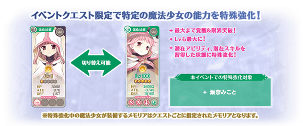 対象の魔法少女を編成して本イベントクエストをプレイする際にステータスを特殊な状態に強化することができます。