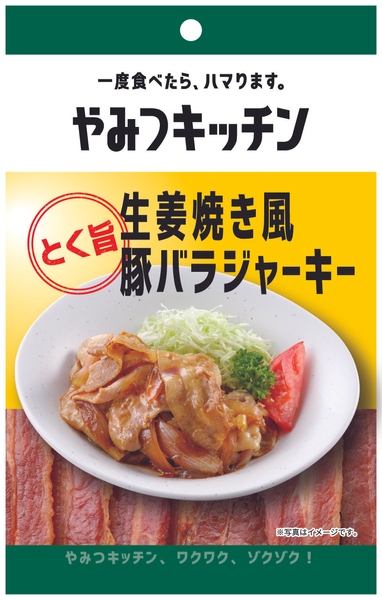 柔らかくジューシー感のある厚めにスライスした豚バラジャーキーを、国産生姜を加えた特製甘辛ダレで味付けをし、生姜焼きのような味わいに仕上げたやみつきな逸品です。