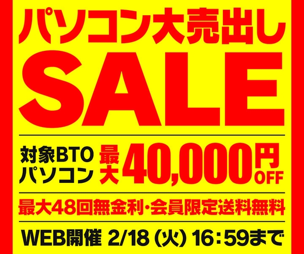パソコン工房インターネット通販ではただいま『パソコン大売出しSALE』を2/18(火)16:59まで実施中!対象BTOパソコンが最大40,000円引き!