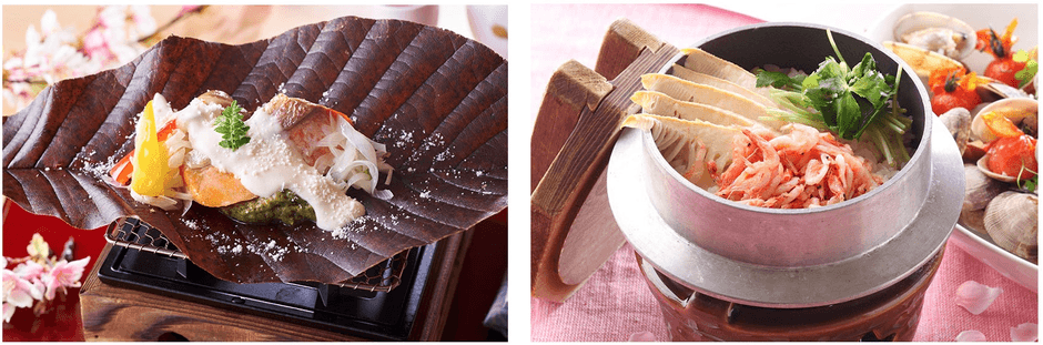 左:飛騨の郷土料理・朴葉味噌焼きも下呂新館の名物メニュー。この春はサーモンをメイン具材に、味噌に春らしくふきのとうを混ぜ込みました。味噌のコクを際立たせるなめらかなホワイトソースを添えたオリジナルレシピでお楽しみください。