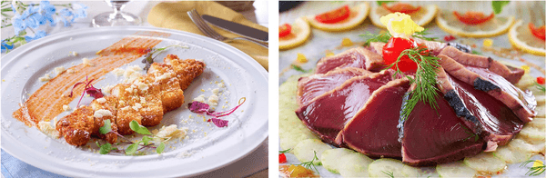 右:馴染みの深いカツオのたたきも洋風スタイルでご提供します。ガーリックの効いたイタリアンソースでお楽しみください。