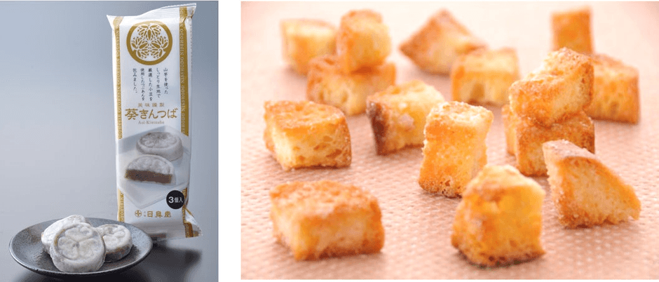 和菓子作りの伝統や歴史文化を守りながら、時代に合わせて新しい挑戦を続ける中で2012年に生まれた商品が写真右の「日光ラスク」。栃木の牛乳と美味しい水で焼き上げたフランスパンで作った一口サイズで、シュガーやメイプルなどバラエティ豊かなフレーバーも魅力です。
