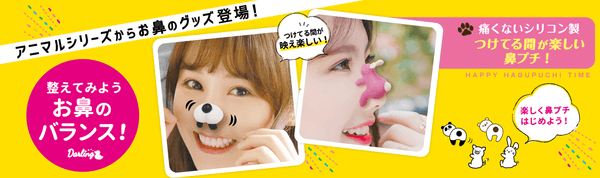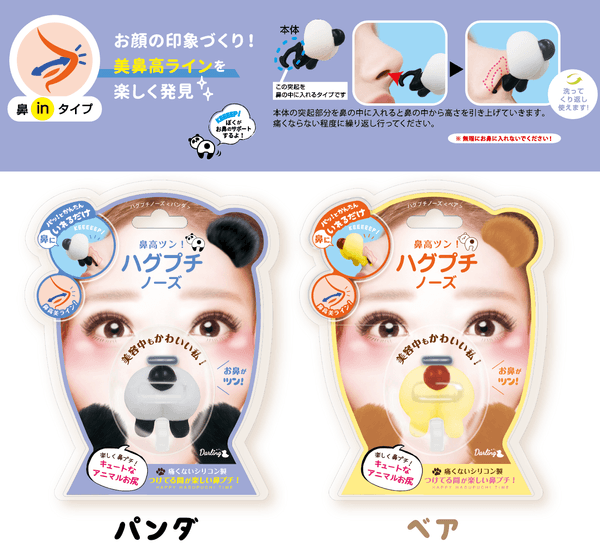 鼻の中にいれて鼻をツンっと見せる「パンダ」「ベア」、鼻に被せて鼻筋をスラッと小鼻に見せる「ウサギ」「ミニブタ」の4種類の動物が、まるでお鼻に抱きついちゃったように見える、かわいくてついつい笑っちゃうおもしろグッズです。