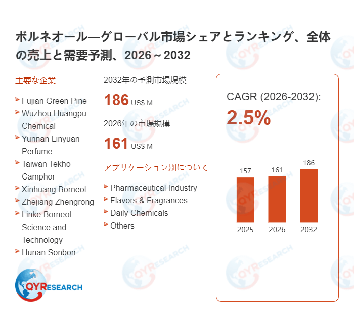 QYResearchが発表した新たな市場調査レポート「ボルネオール―グローバル市場シェアとランキング、全体の売上と需要予測、2026~2032」によると、世界のボルネオール市場規模は2025年の約157百万米ドルから2026年の161百万米ドルへと順調に拡大すると見込まれ、予測期間中は年平均成長率(CAGR)2.5%で成長し、2032年には183百万米ドルに達すると予測されている。