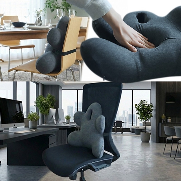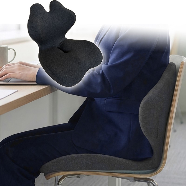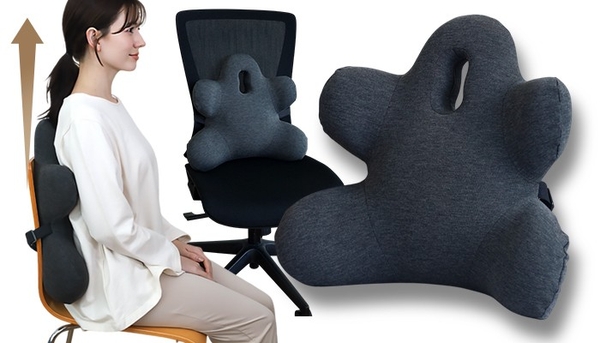 背中からお尻まで支える一体型のチェアクッション。姿勢を矯正するのではなく崩れにくくする設計で、自然に楽な美姿勢を作り出します。
