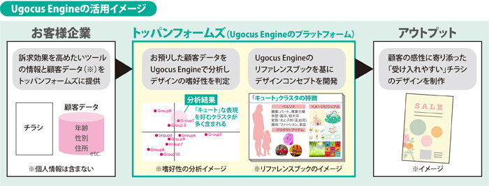 情報管理ソリューションのトッパン・フォームズ株式会社(以下、トッパンフォームズ)は、デザイン表現や表記における生活者の嗜好性を捉えて、デザインを最適化するデザインプラットフォーム「Ugocus Engine(ウゴカス エンジン)」を開発しました。トッパンフォームズは企業からコミュニケーションツールのデザインを委託された場合、「Ugocus Engine」で体系化したノウハウに沿ってデザイン制作をすることが可能になります。「Ugocus Engine」は2015年10月を目処にテスト運用を開始します。