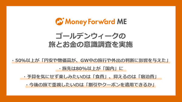 株式会社マネーフォワードは、お金の見える化サービス『マネーフォワード ME』の利用者を対象に、2024年のゴールデンウィーク(GW)の旅行とお金についてアンケート調査を実施しました。