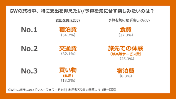 ・GWの旅行で支出を抑えたいのは、第1位「宿泊費(34.7%)」、第2位「交通費(32.1%)」、第3位「買い物(私用)(13.3%)」