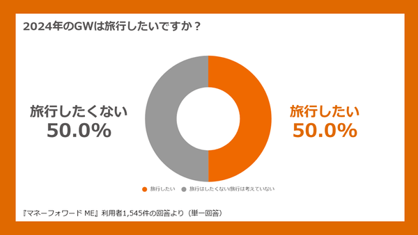 ・今年のGWに「旅行したい」が50.0%、「旅行したくない/旅行は考えていない」も50.0%という結果に