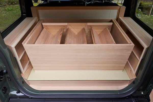 前席との境には、雪見障子の構造から着想を得た上下に可動する「障子」。天井には柔らかな風合いが美しい金糸が織り込まれた「西陣織」。両側の棚は「指物」の技術を用い、京都北西部・京北の杉ですっきりと仕上げました。床にはい草のにおいが車内に充満しないようにと配慮した、和紙製の「畳」。リアドアの内側には、「指物」の技術で床の間のような棚を設け、「漆」を施した「錺金具」が特別な棚であることを暗示。花器などを飾る場所として、茶室の趣を残しました。そして前席、シフトレバーに銀の「高蒔絵」を施し、亭主である運転手が経年の変化をそっと楽しめる遊び心も忘れません。お茶室のごとく、ジムニーに職人の技を集結しました。