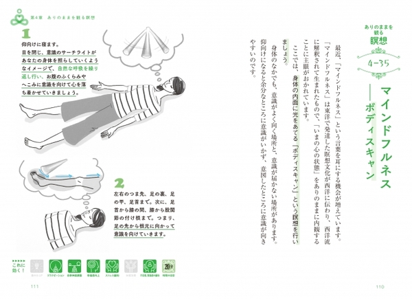 各メソッドがどんな目的に作用するのか、本書では左下にアイコンを表示し、効果を明確に分類しています。熟睡できない、集中できない、肩こりがひどい、すぐにクヨクヨする、ストレスに弱い、腰痛があるなど、悩みや改善したいポイントに合わせて選んでみてください。各瞑想法やストレッチ、呼吸法にかかる所要時間の目安も明記してあります。