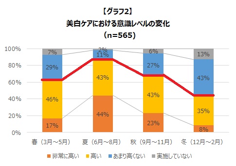 次に美白ケアをしていると回答した人に対し、季節別の美白に対する意識の変化を聞くと、夏(6月~8月)は約9割が「意識が高い」と回答しているのに対し(「非常に高い」と「高い」の合算値)、その割合は秋(9月~11月)に約6割と約20ポイント低下していることがわかりました。(グラフ2)