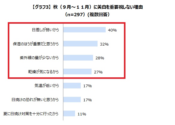 9月以降に美白への意識が低下する理由を聞くと、「日差しが弱いから」「保湿のほうが重要だと思うから」「紫外線の量が少ないから」「乾燥が気になるから」などの理由が上位を占めました。秋はUVケアの必要性が低下し、乾燥対策として保湿ケアの優先度があがるため、美白ケアに対する意識が低下していると考えられます。(グラフ3)