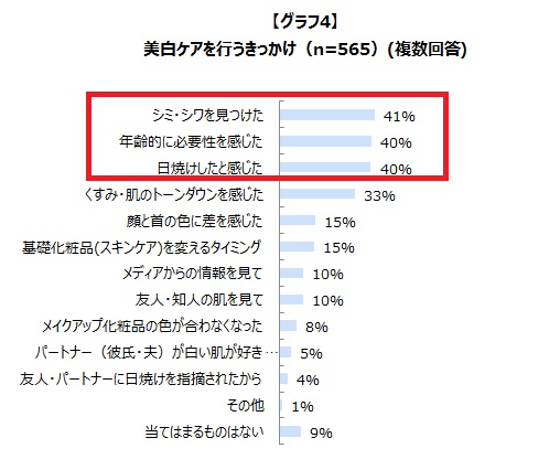 美白ケアを行っていると回答した女性に対しそのきっかけについて問うと、「シミ・シワを見つけた」「年齢的に必要性を感じた」「日焼けしたと感じた」がほぼ同数で最も多く、実際に肌にダメージを感じてから美白ケアを行う人が多いことがわかりました。(グラフ4)