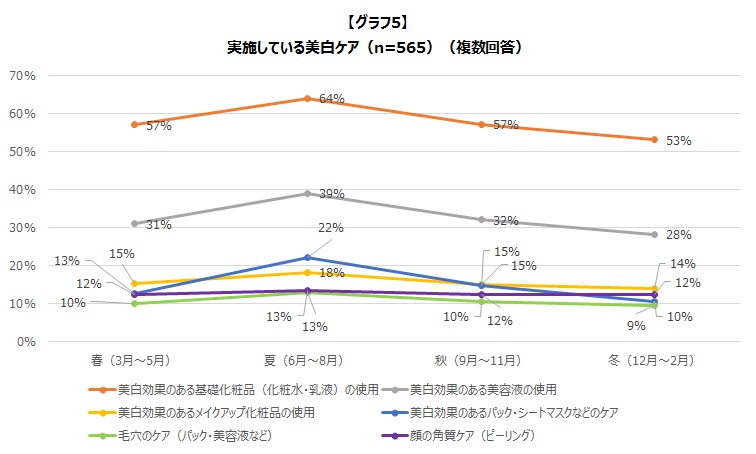実際に美白ケアで実施していることを季節別にみると、年間を通して「美白効果のある基礎化粧品」の利用率が50%以上と高く、また、「美白美容液」の利用率も年間を通して約3割を保っていることから、日々の美白ケアは基礎化粧品で行う人が多いことがわかりました。一方で「美白効果のあるパック・シートマスク」「角質ケア」「毛穴のケア」などの特別ケアは、夏季(6月~8月)でも約2割にとどまり、年間を通して実施している人は約1割と少数であることがわかりました。(グラフ5)