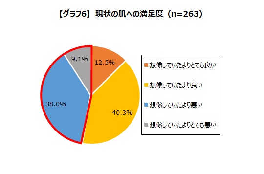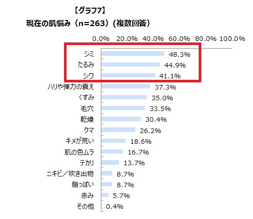 次に、20代の頃に美白への意識が高かったと回答した40代・50代女性に対し、現在の肌の状態を聞くと、約半数が「想像していたより悪い」(想像していたより悪い:38%、想像していたよりとても悪い:9.1%)と回答し(グラフ6)、その主な悩みとして光老化が原因のひとつである「シミ」「たるみ」「シワ」が上位を占めました(グラフ7)。