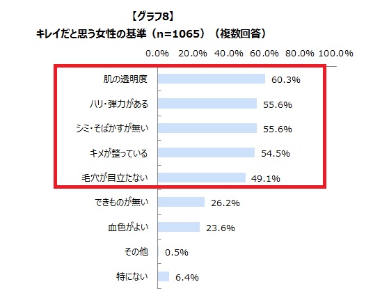 さらに、40代・50代の女性に対し、同年代で肌がキレイだと思う女性の特徴を聞くと「肌の透明度」「ハリ・弾力がある」「シミ・そばかすが無い」が最も多く、白肌の支持率が高いことが伺えます。(グラフ8)