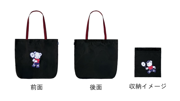 ファミリアのオリジナルキャラクター「ファミちゃん」がテニスラケットを持つデザインが愛らしいエコバッグ。持ち手のファミリアチェック※3がポイントです。内側にはオープンポケットがあり、小物を収納可能。バッグを使用しない時は、内側ポケットにコンパクトに収納でき、持ち運びに便利です。収納時は、テニスをする「ファミちゃん」のデザインも楽しめます。日々の買い物からテニス観戦まで、さまざまなシーンで活躍するアイテムです。