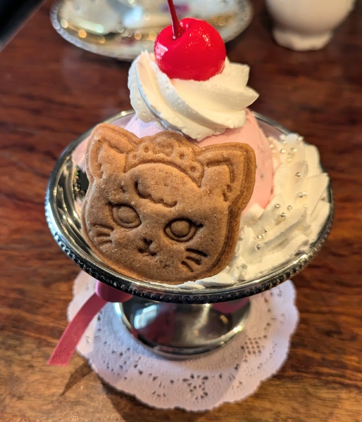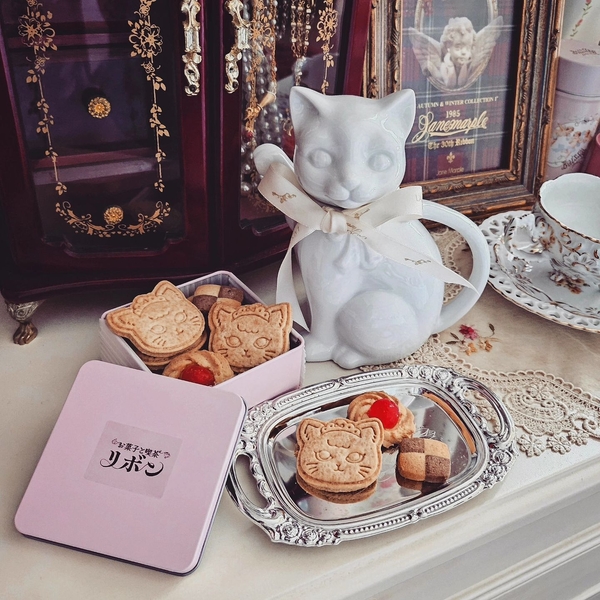 店内は、猫好きの店主らしく、飼い猫をモチーフにしたロゴが特徴です。また、イギリス製の陶器の猫のポットや猫に関連するアイテムが数多く揃っており、猫好きにはたまらない空間です。さらに、店主がこだわり抜いたヴィンテージ食器の数々が、喫茶リボンの世界観を演出しています。
