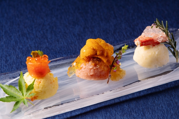 主に北海道で収穫されるインカレッドは、作付面積が北海道全体の1パーセント(*4)以下の品種です。粘り気が強く、しっとりとした食感が特徴で、表皮や果肉が赤色なので、色味でも楽しめます。これには、北海道で漁獲量1位(*5)を誇り、とろける食感の濃厚なウニを組み合わせました。昆布出汁を使ったウニ醤油のジュレが豊かな香りを添え、口の中で濃厚な旨味が広がります。