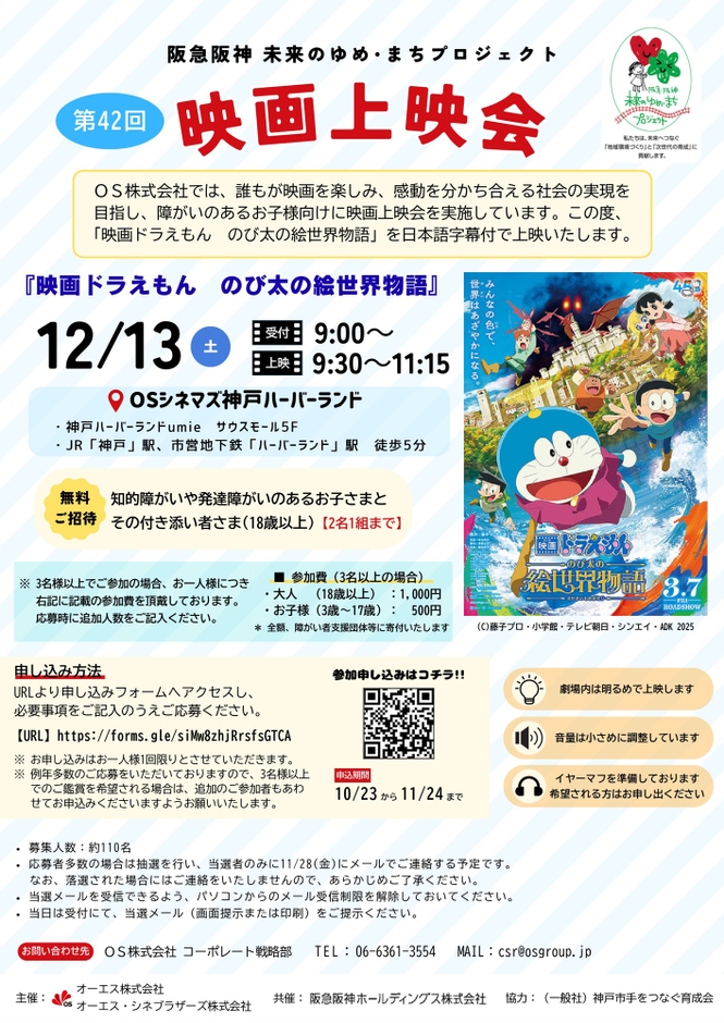 神戸市でシネマコンプレックス「OSシネマズ」を経営するオーエス株式会社(本社:大阪市北区、代表取締役:金谷伸雄)は、阪急阪神ホールディングスグループの社会貢献活動「阪急阪神 未来のゆめ・まちプロジェクト」の一環として、知的障がいや発達障がいのあるお子様とそのご家族を対象とした映画上映会を、2025年12月13日(土)にOSシネマズ神戸ハーバーランドで実施いたします。