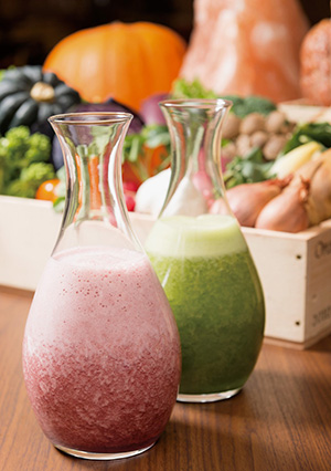 その時季、美味しいものを知っている大阪府中央卸売市場からの“目利き野菜”を、オリンピア・西洋料理長がチョイス。今年20周年を迎えた“自然を、おいしく、楽しく。”をスローガンとするカゴメ株式会社の管理栄養士 廣田氏が、その野菜とカゴメ「野菜生活100」を使用して、味はもちろん栄養や彩りも考えお客様に喜んでいただけるスムージーとしてご提案。リニューアル以来、女性だけでなく、男性にも好評のサラダバー「マルシェ・キッチン」にて提供します。