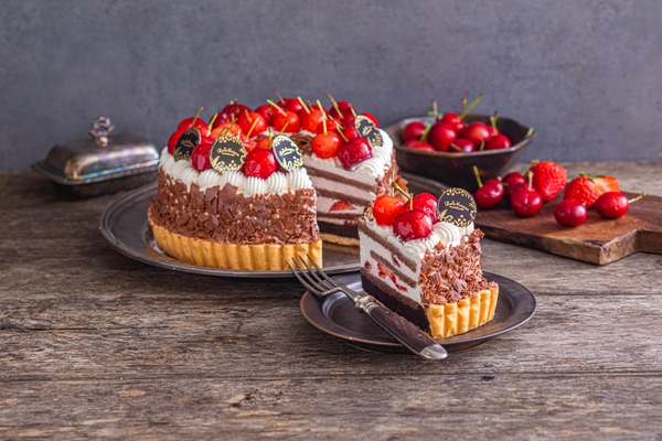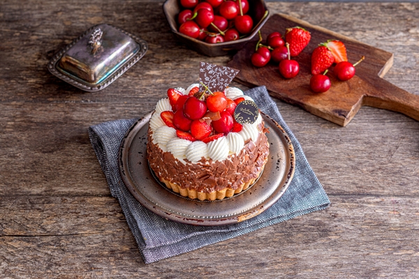 チョコカスタードタルトに濃厚なチョコスポンジとチェリークリーム・甘酸っぱいいちごをサンドしました。旬のさくらんぼとアメリカンチェリーを飾り、フランス、アルザスの伝統菓子「フォレノワール」をタルトにしました。