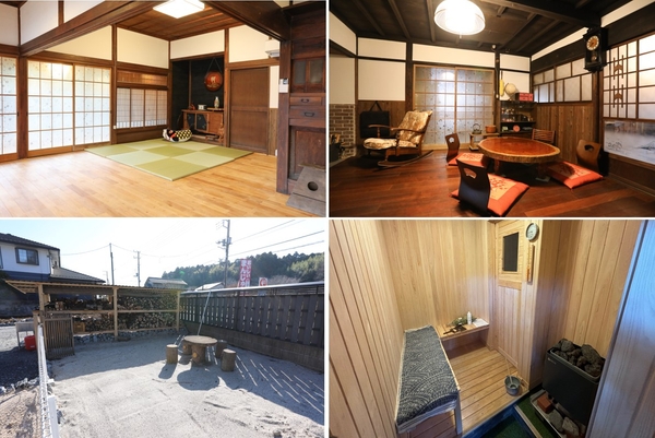 築約100年の古民家を、オーナーが1年がかりでDIY改修し完成。囲炉裏・かまど・五右衛門風呂・手押し井戸など、昭和時代の設備の他、サウナ、ドッグランなどの人気の設備も備えている。