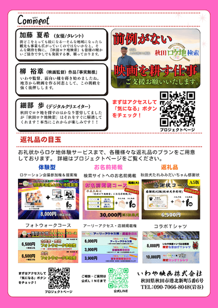 また、クラウドファンディングのストレッチゴールとして、空き家を買い取って撮影ハウススタジオにする計画も検討されています。学生や自主映画制作者にも安価に提供し、秋田の映像制作環境をさらに充実させる構想です。