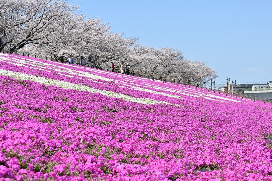 東京の北の玄関口を華やかに彩る芝桜は、荒川赤羽桜堤緑地のソメイヨシノに続く春の風物詩として、河川敷を散歩する人や埼玉方面から電車で北区を訪れる人々の目を楽しませている。